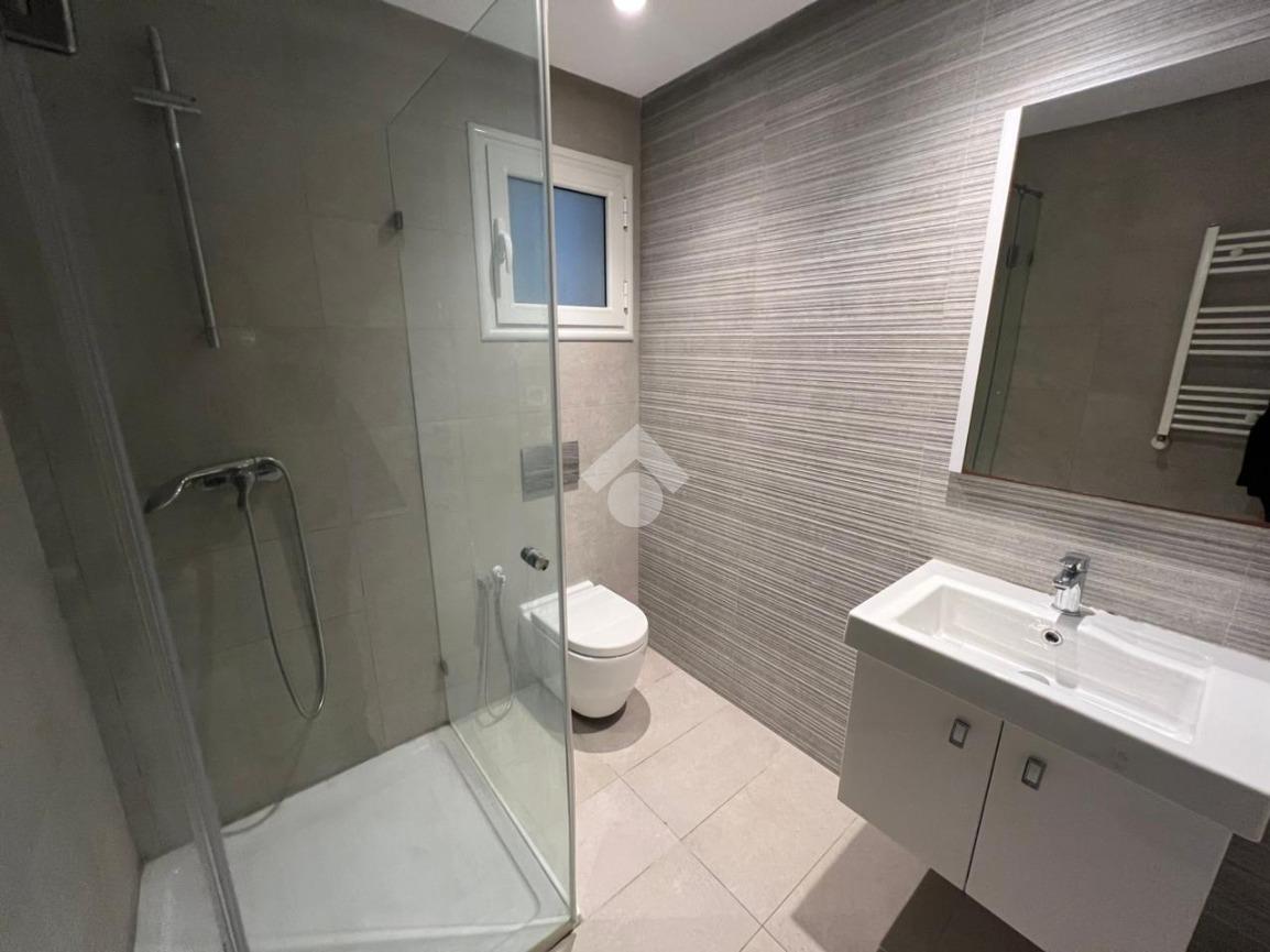La partie jour comprend également une salle d’eau moderne avec une cabine de douche.