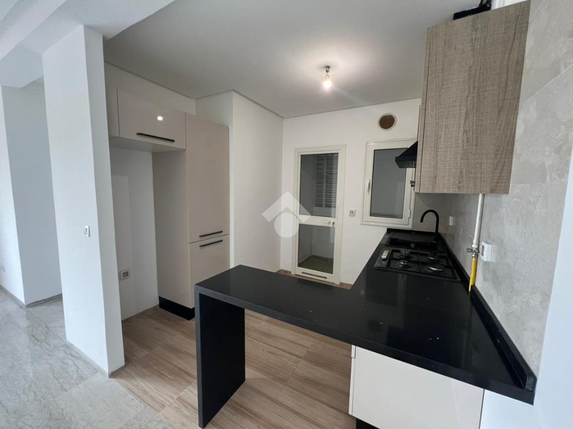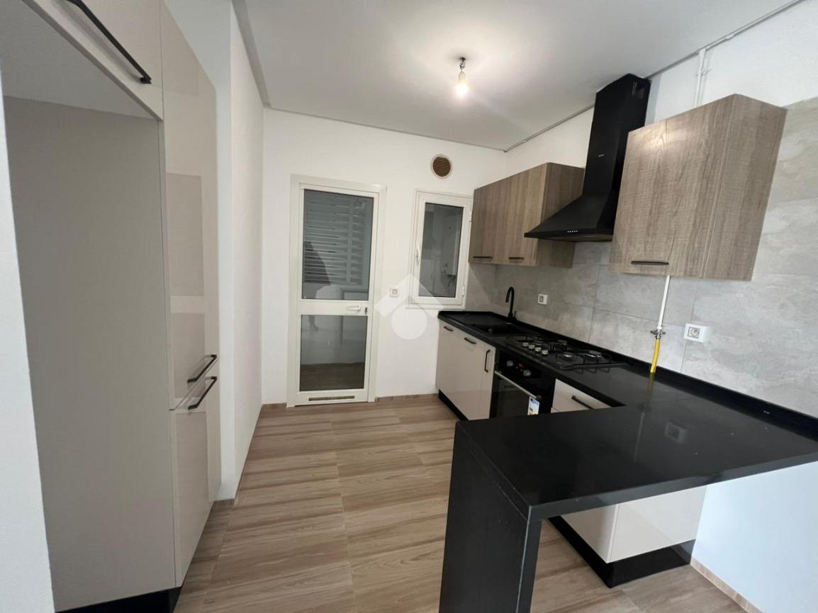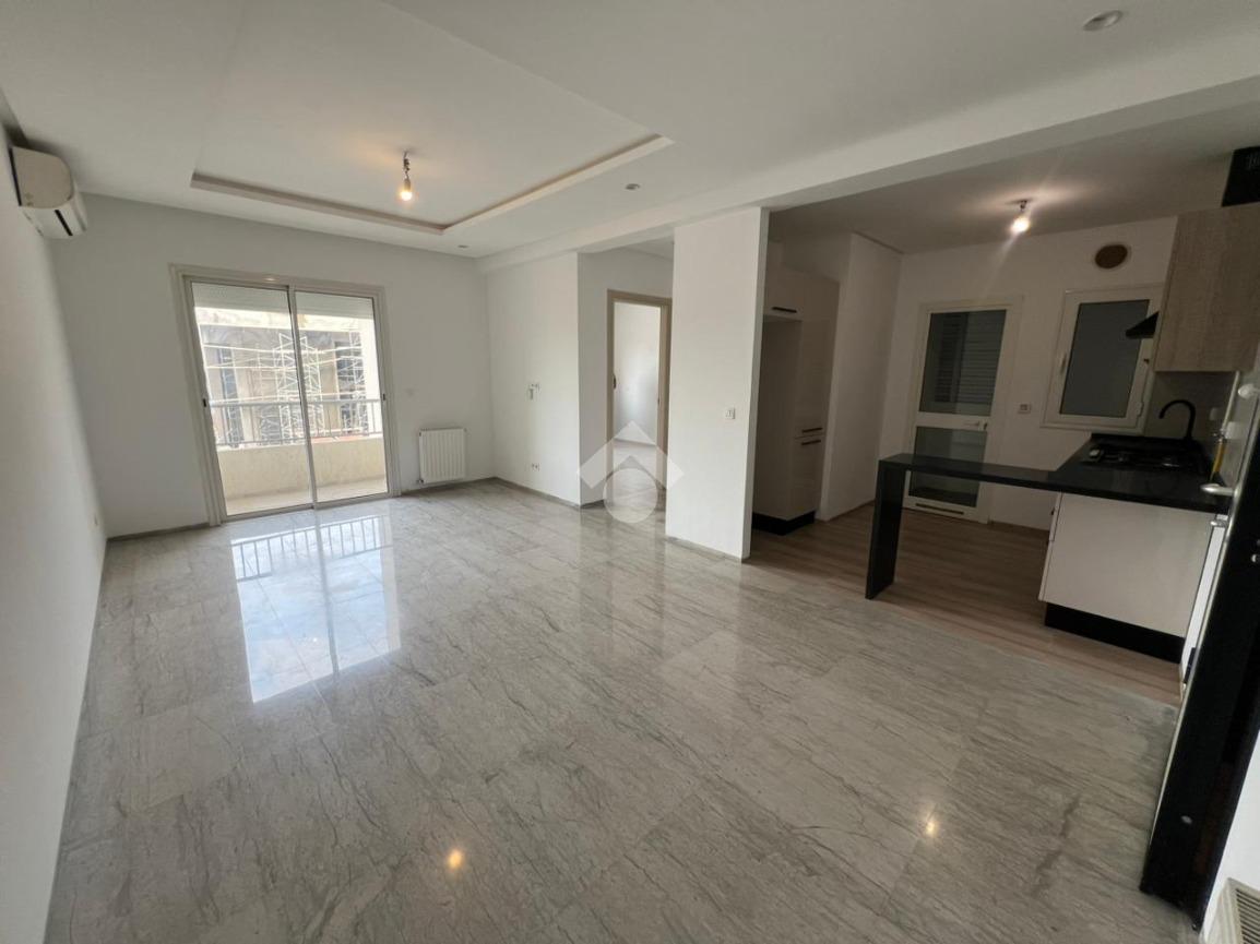 À l’entrée, on découvre un salon spacieux et lumineux qui s’ouvre sur un balcon, offrant un espace de vie agréable. La cuisine est ouverte sur le salon ; elle est aménagée et équipée d’une plaque de cuisson, d’une hotte aspirante et d’un four.