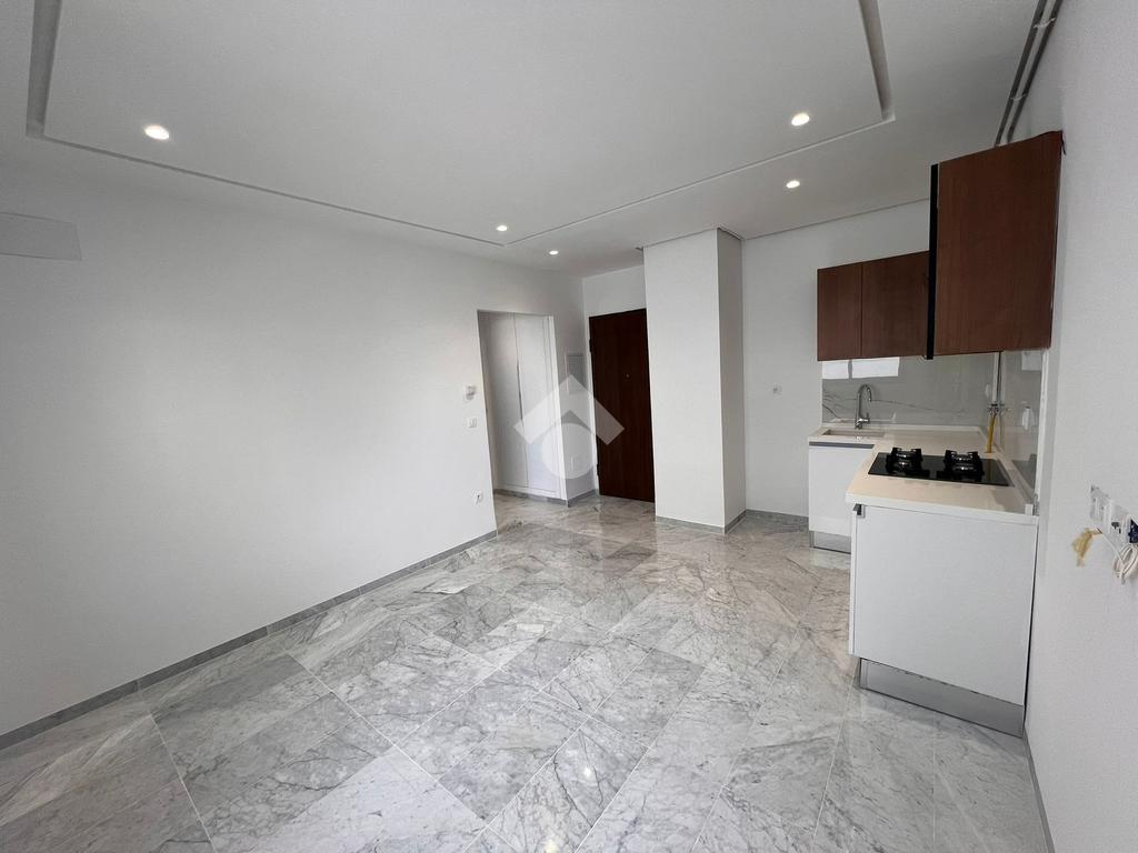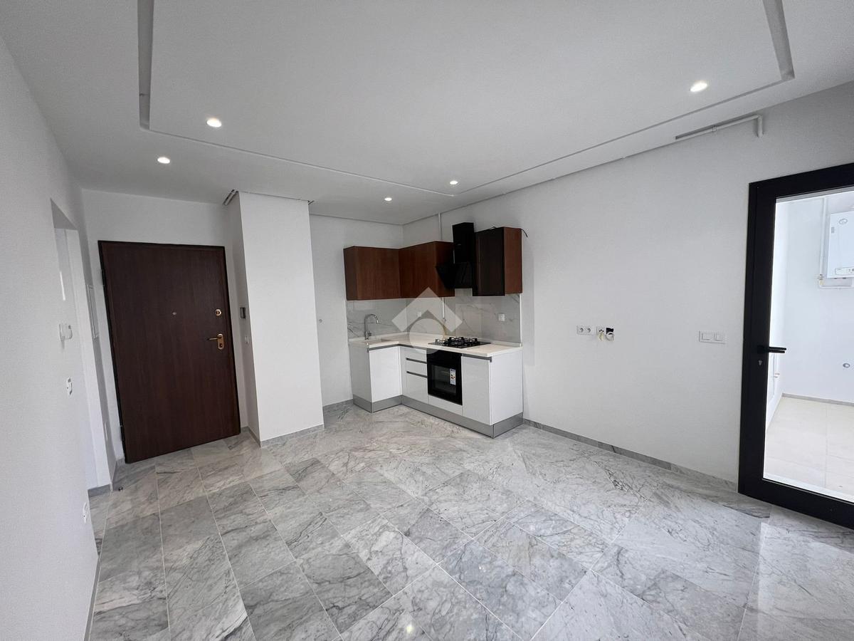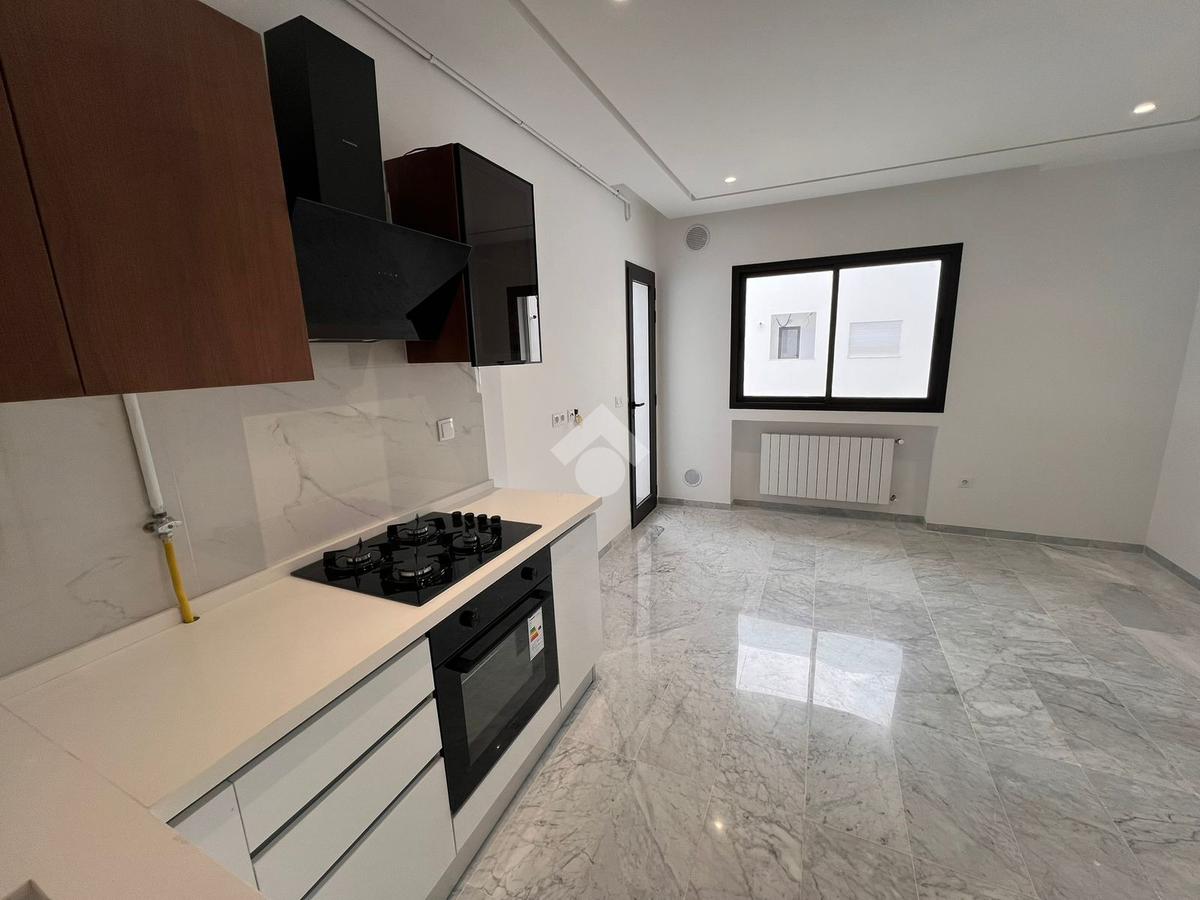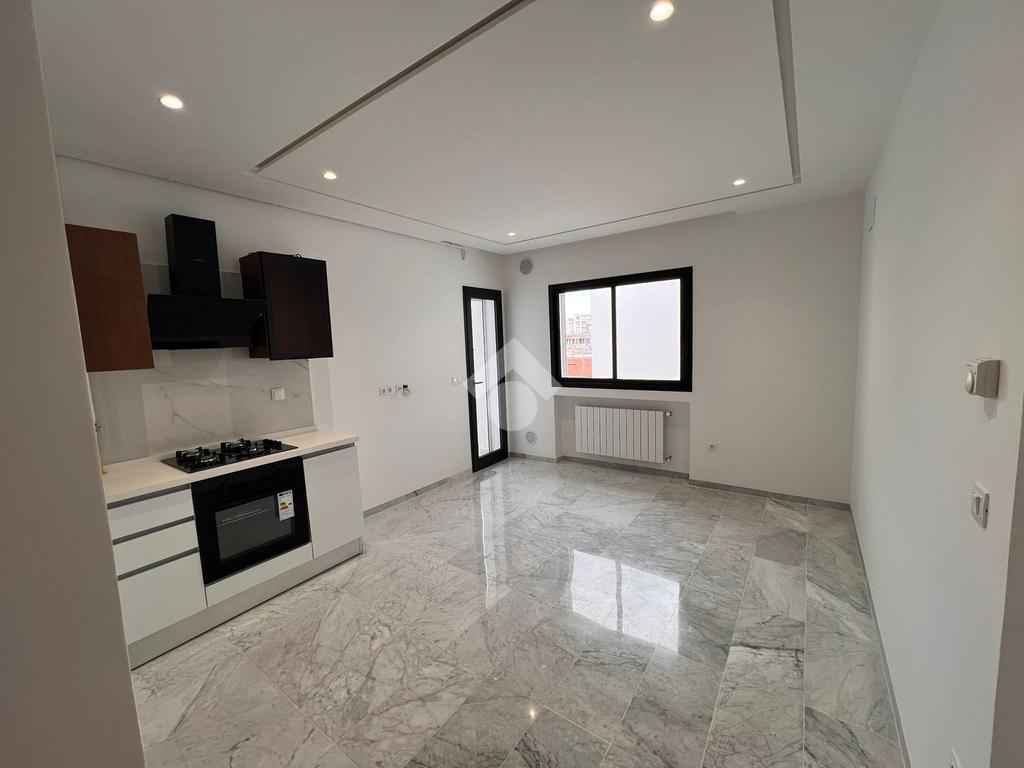 À l’entrée, on découvre un salon spacieux et lumineux qui s’ouvre sur un balcon, offrant un espace de vie agréable. La cuisine est ouverte sur le salon ; elle est aménagée et équipée d’une plaque de cuisson, d’une hotte aspirante et d’un four.