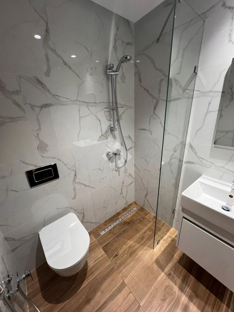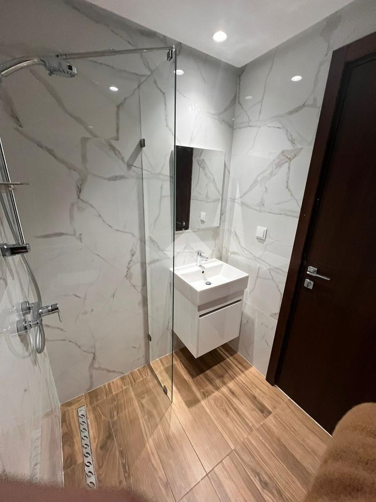 La partie jour comprend également une salle d’eau moderne avec une cabine de douche.
